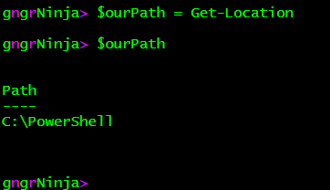 Let's start by using the command Get-Location, and using the variable $ourPath to hold that object. We'll then get the value of the variable, and see what object type is returned.