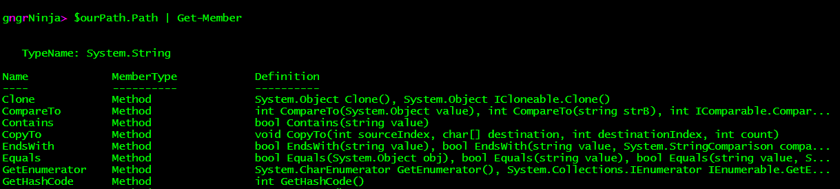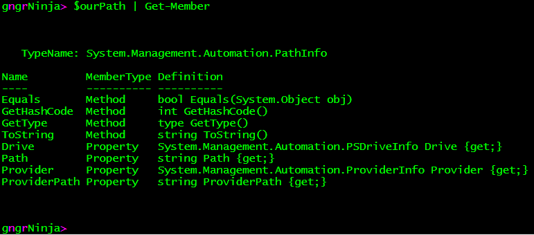 Now let's pipe $ourPath to Get-Member and see what object type, methods, and properties are returned.