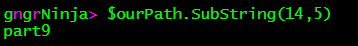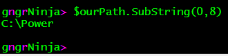 You can see that the values of (0,8) with the string 'C:\PowerShell\part9' returns C:\Power. That is because we start at the first character (0), and end after the value (8) is reached. Notice that from left to right, the letter 'r' is the eighth letter in the sequence.