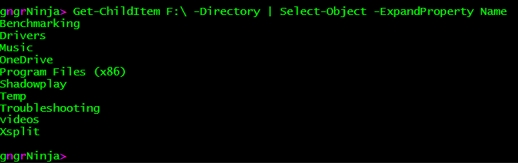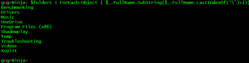 Let's take a look at another example of this in use. I will get a list of folders on my F:\ drive, and then use a ForEach-Object loop to iterate through and only display the folder names. You can do this with Get-ChildItem as well, but that wouldn't help this example :)