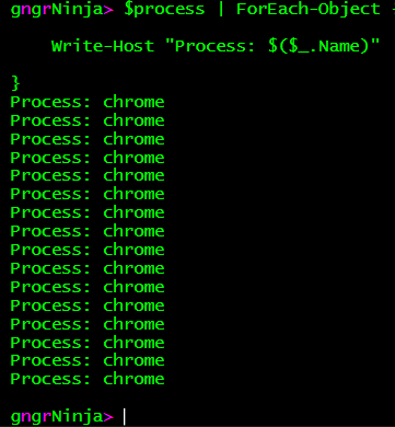 Well that doesn't look nice! That's because there are both a lot of processes, as well as different properties of each process returned. The default isn't very pretty. If you want to expand an object's property inside of an expanded string, you'll need to encapsulate it inside of a sub-expression. Let's create a ForEach-Object loop, and then display the property name of each process in it.