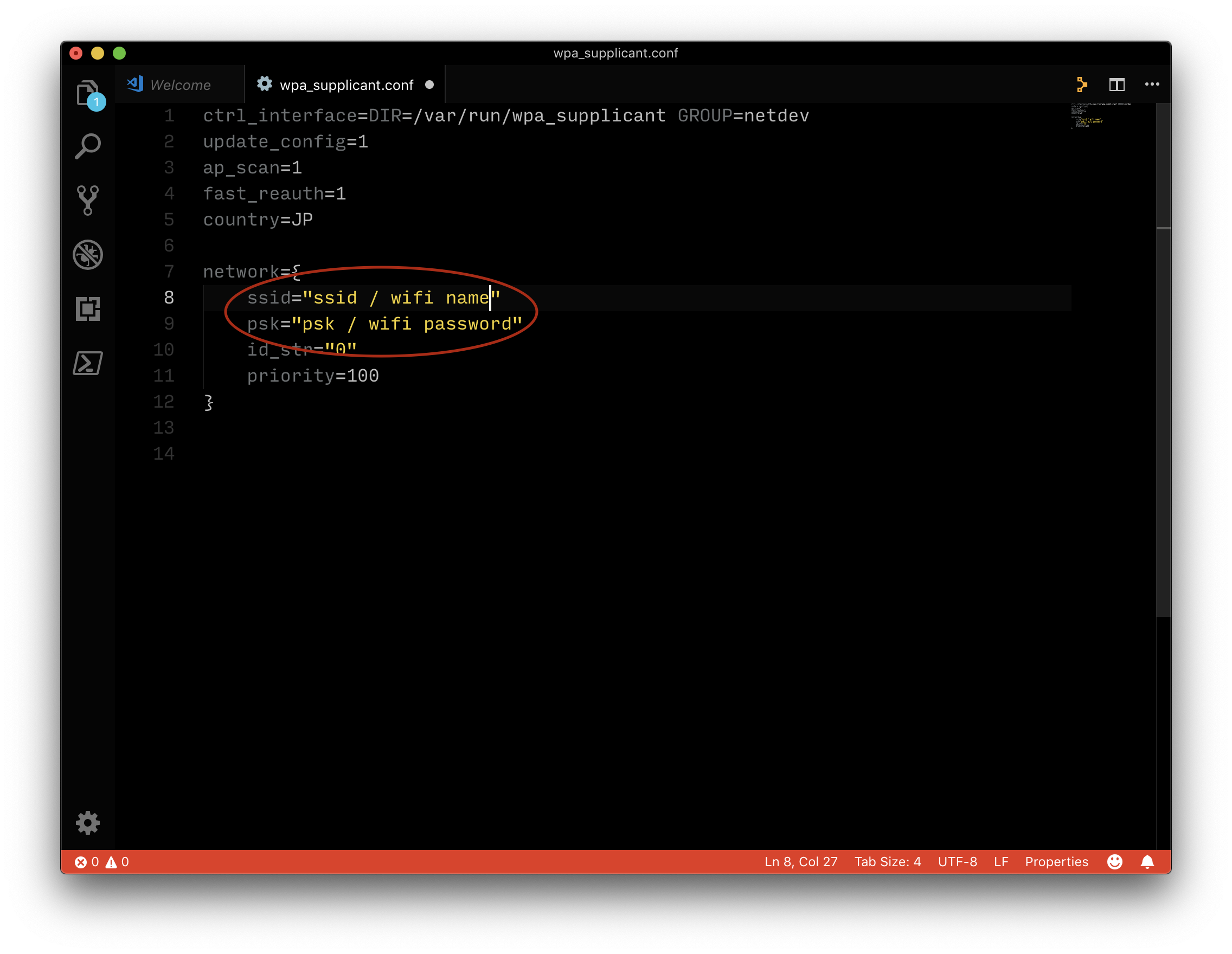 ctrl_interface=DIR=/var/run/wpa_supplicant GROUP=netdev update_config=1 ap_scan=1 fast_reauth=1 country=US network={ ssid="Your network's SSID" psk="Your network's password/psk" id_str="0" priority=100 }