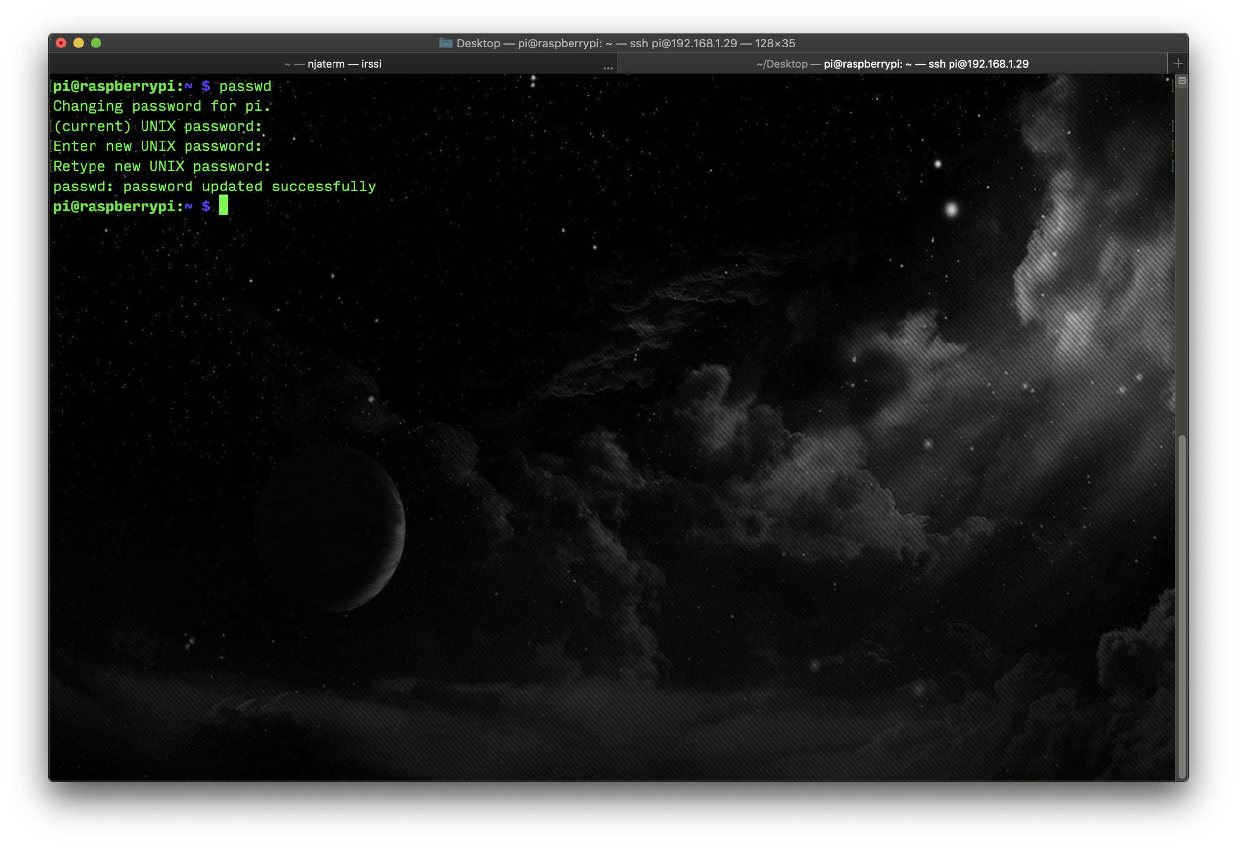 (note) You will first be prompted for the current password, so enter raspberry for that. Then select your new password, and confirm it. You will not be able to see anything as you type them out.