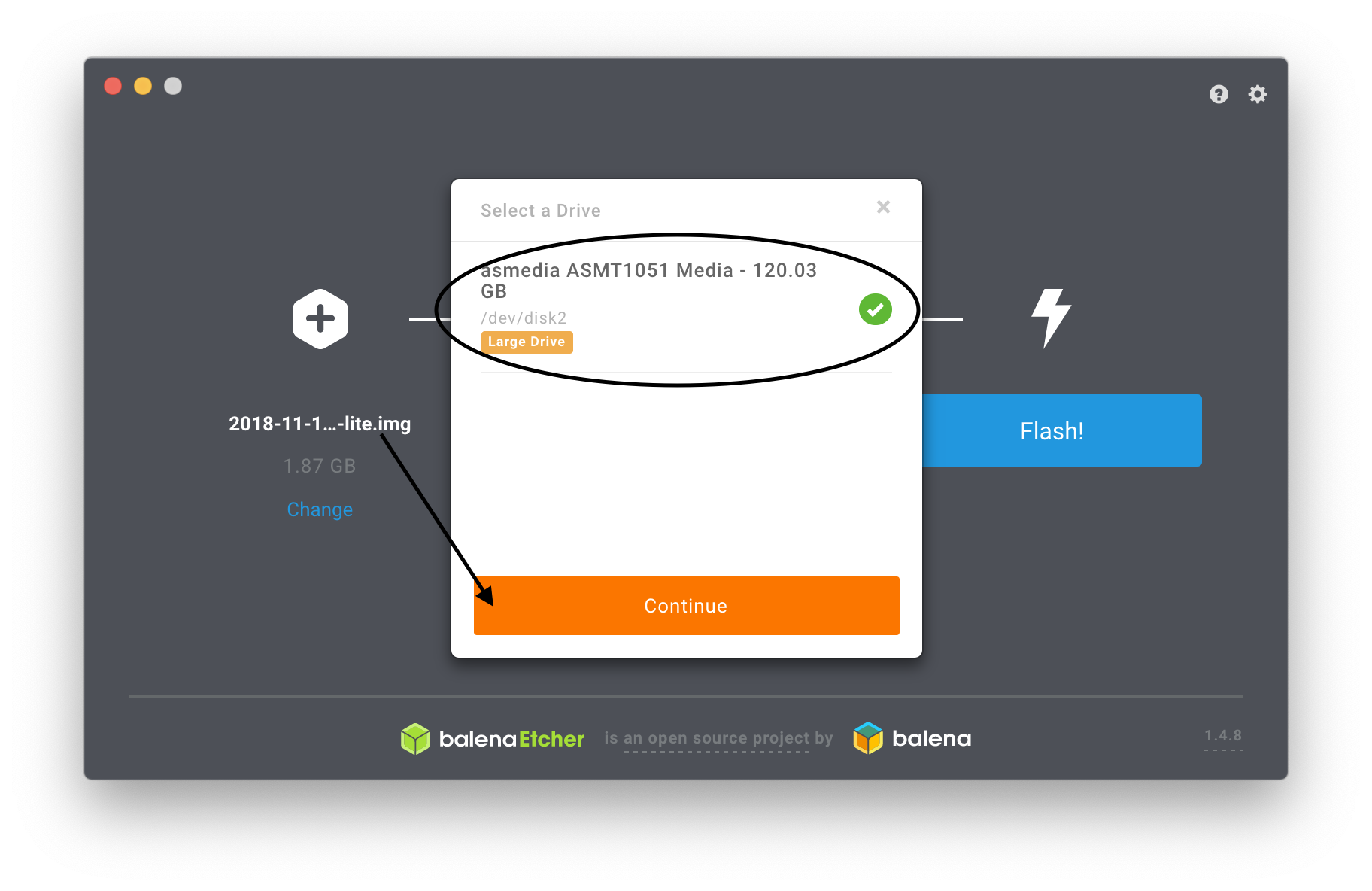 6. Now choose “Select drive”, and pick the drive / SD card you recently attached, and click “Continue”.