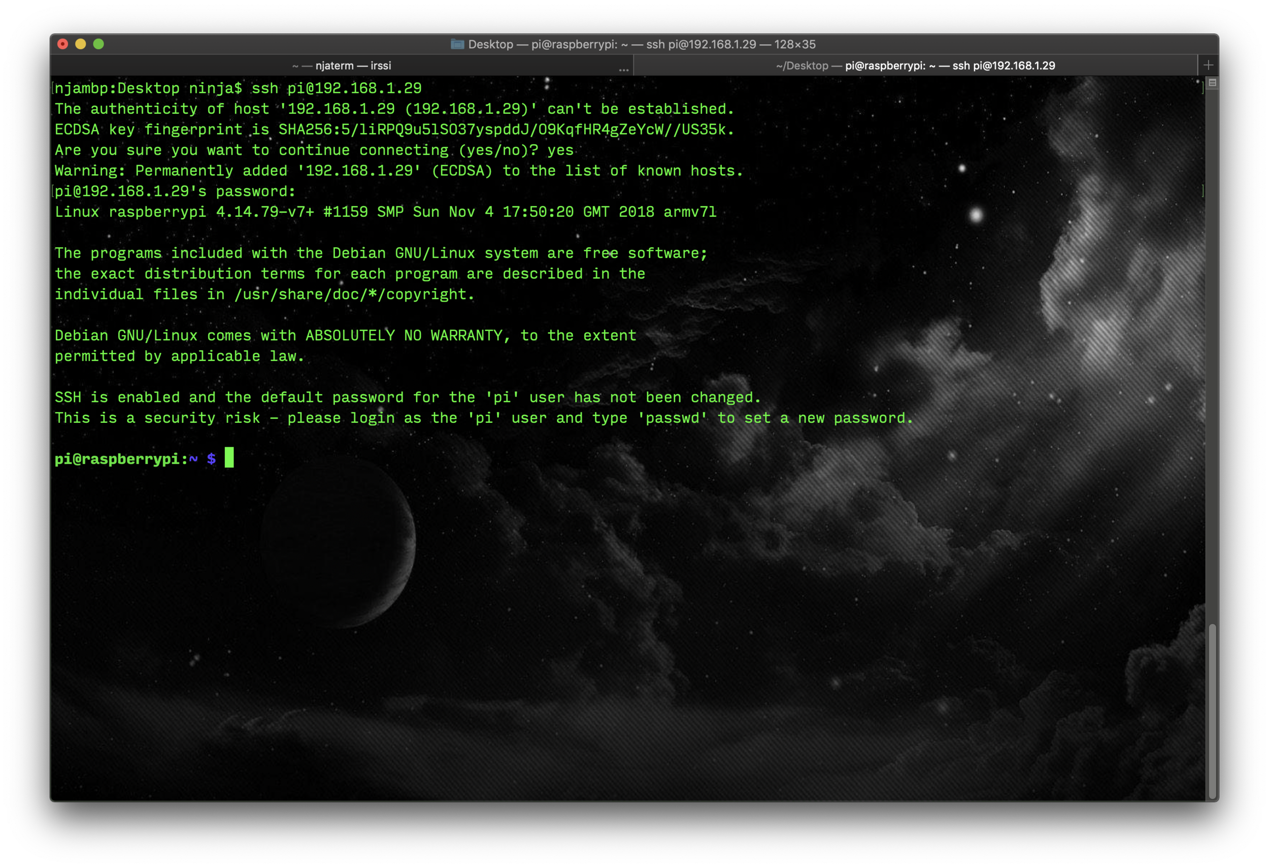 3. Now that you have the IP address, ssh in! If you’re on Windows, and need some help, check out this article: https://learn.adafruit.com/adafruits-raspberry-pi-lesson-6-using-ssh/ssh-under-windows. For this example I will be using the Terminal app on OSX.