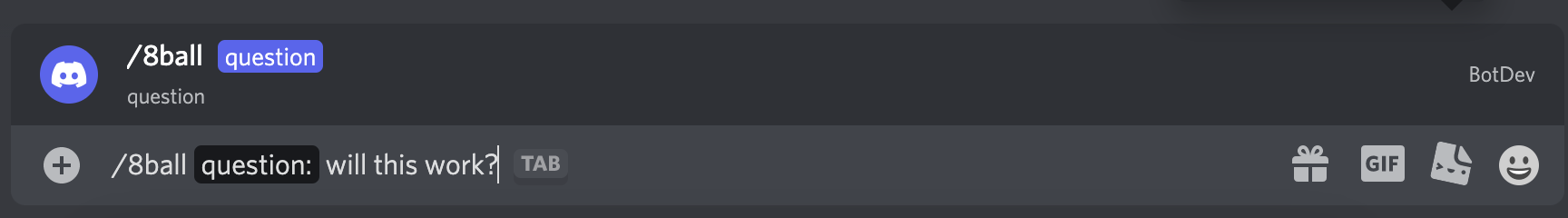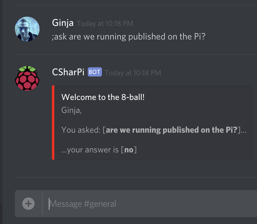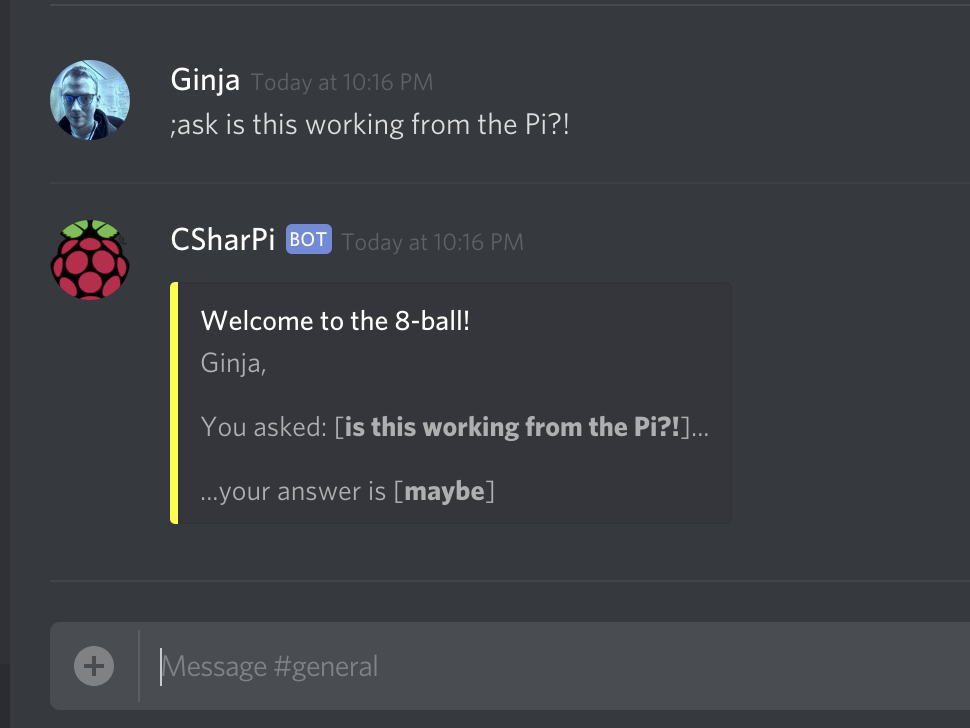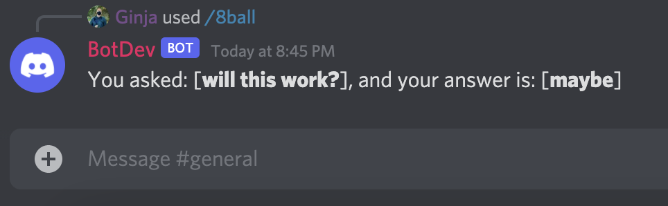 Now that the bot is running, we can test our 8-ball command.