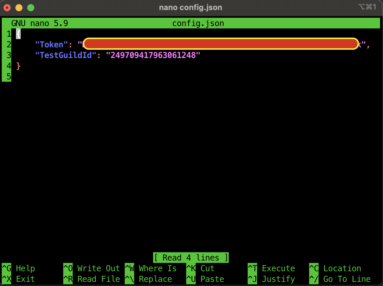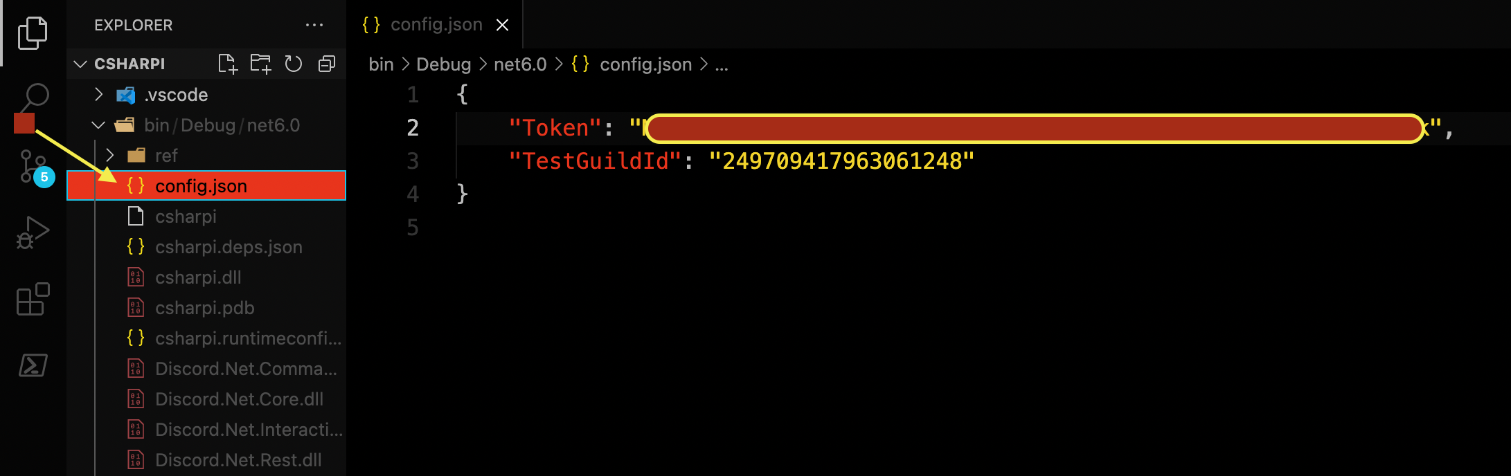 In this file we want to ensure the Token and TestGuildId are there as such: