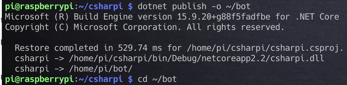 dotnet publish -o ~/botThen you’ll want to get into the bot’s folder: