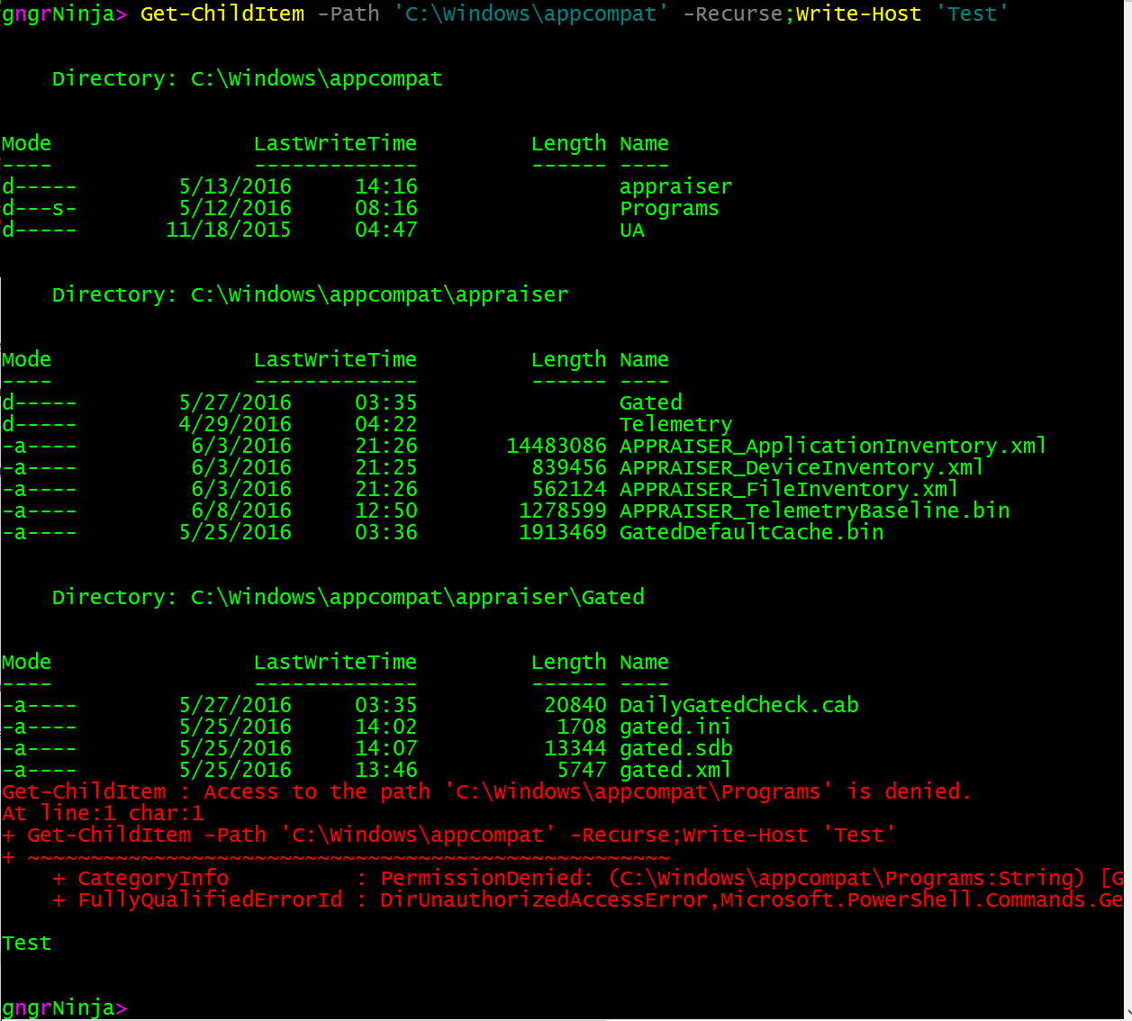 Get-ChildItem -Path 'C:\Windows\appcompat' -Recurse -ErrorAction Stop;Write-Host 'Test'