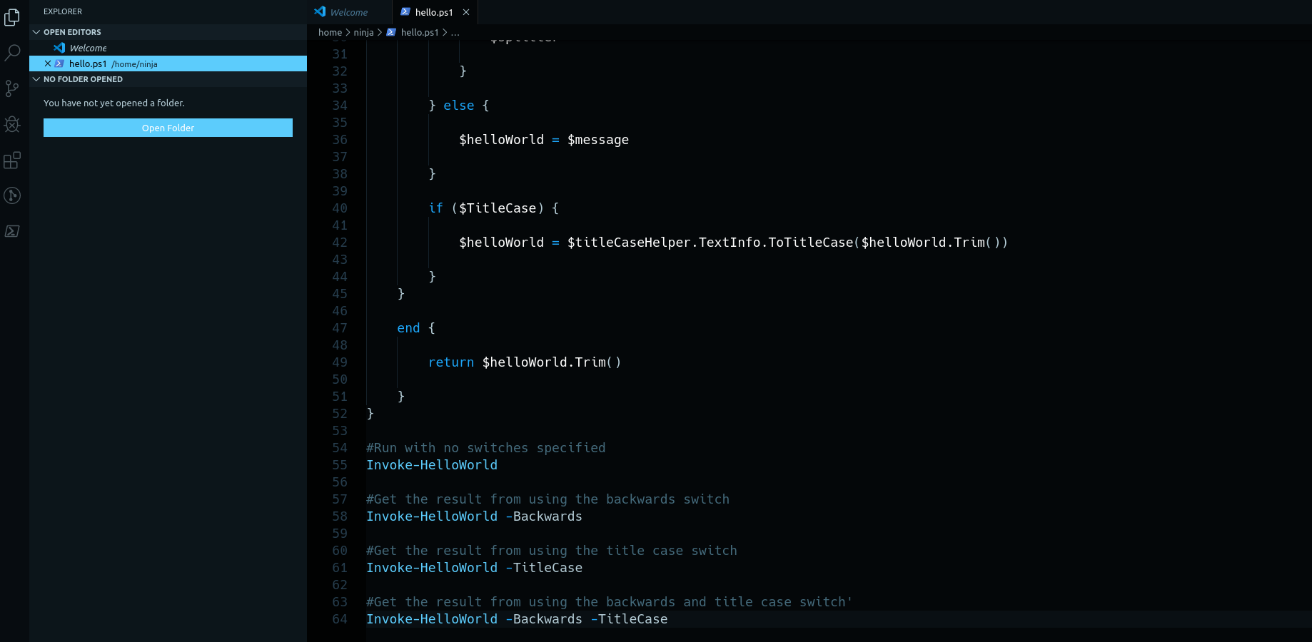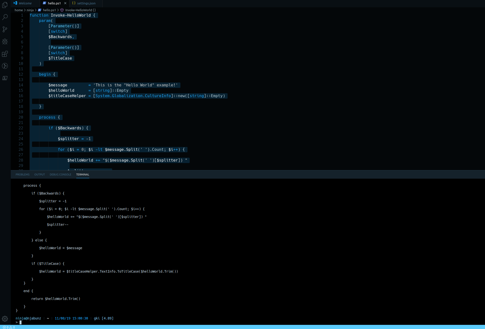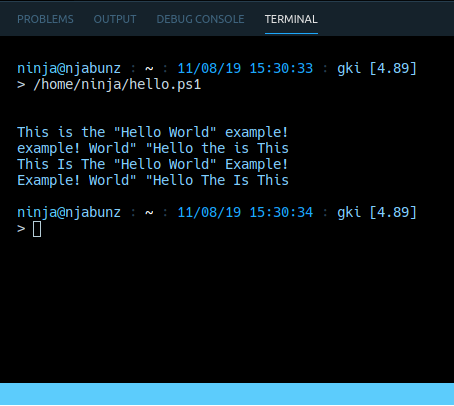 Once you’ve performed the above steps, we will get Visual Studio Code setup with the hello.ps1 script ready to be edited. The Terminal will be at the bottom, and the script editor up above.