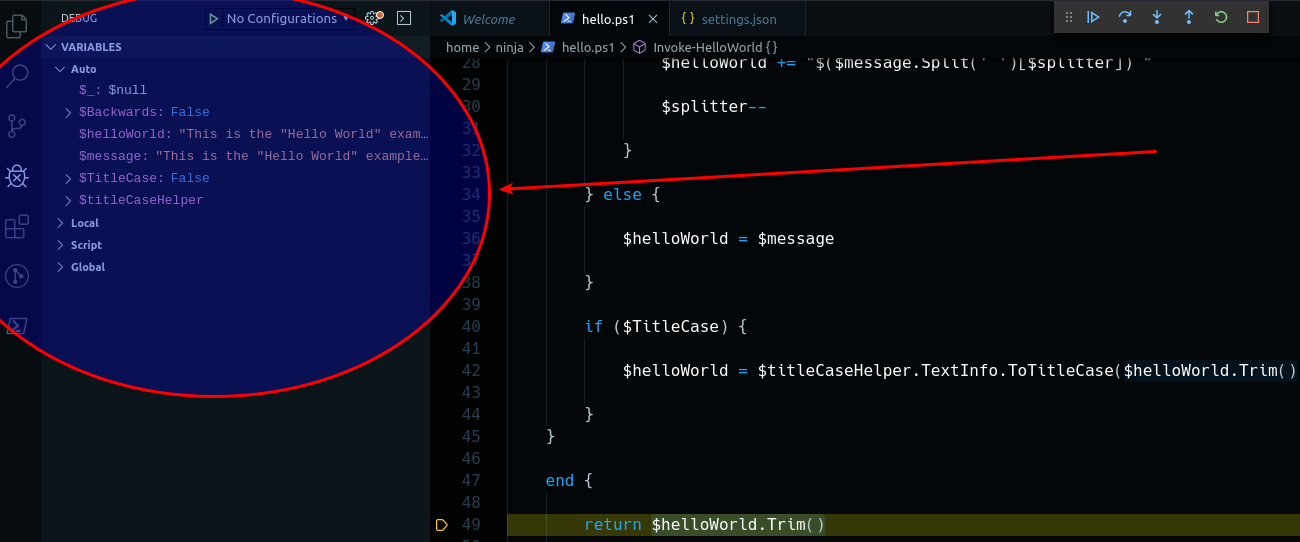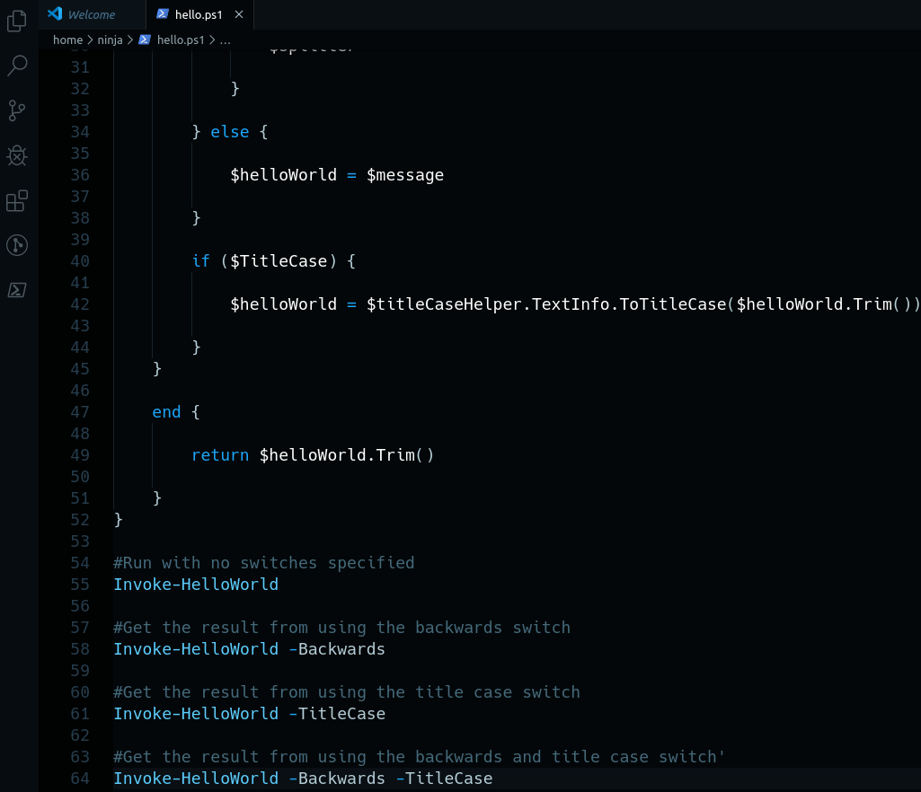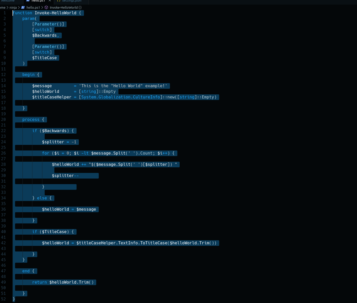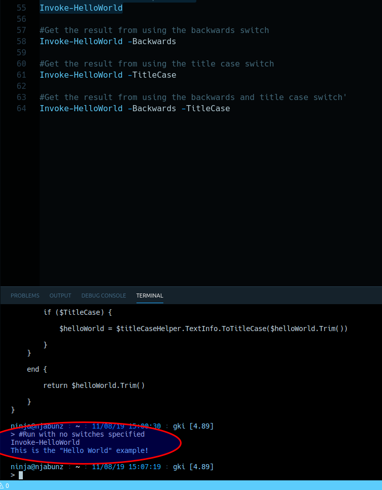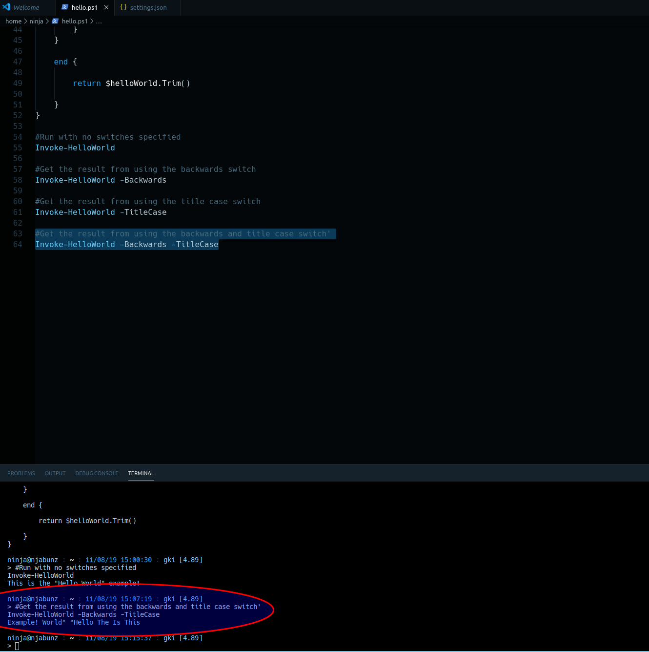Highlight the example Invoke-HelloWorld -Backwards -TitleCase, and run it [F8]