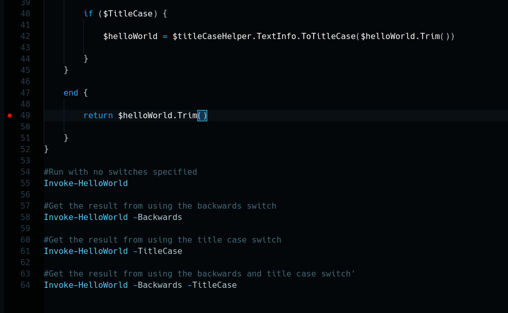 For this example I will add a breakpoint on line 49 (by clicking in the blank space to the left of the line number), which is the return line of the function: