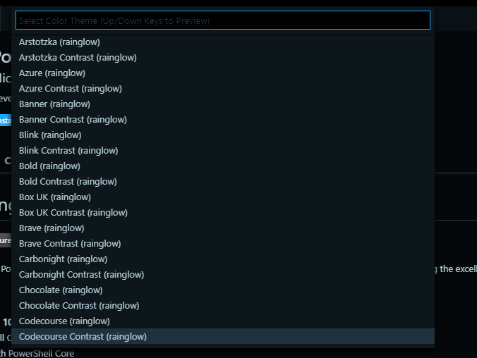 Feel free to dig through them, and see which one you like the most. I recommend starting with Codecourse Contrast (rainglow) (which you can search for to make selecting it quicker)